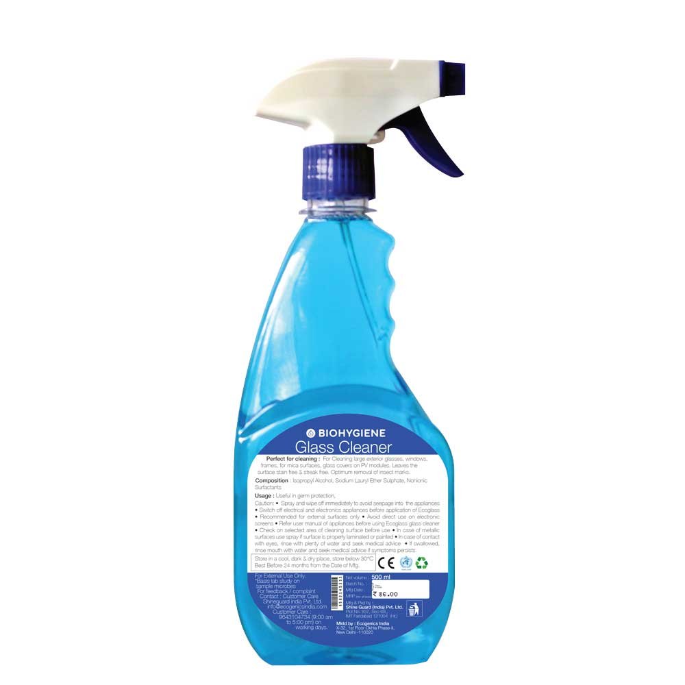 To bring back the original glow of the glasses, you need the Ecogenics Glass cleaner for proper cleaning of all stains, be it film, grime or fingerprints. To keep your windows, appliances, cupboards and furniture tip-top, the Ecogenics Glass cleaner is a must-have among your household cleaning products. The all-purpose surface cleaning agent is a user-friendly high-pressure spray dispenser. This multi-purpose surface spray is suitable for all household purposes including glass, floor, walls, kitchen and table tops, stainless steel, tiles, grill areas, rubbish bins etc. Biohygiene unique patented biodegradable formula uses the microorganisms to work as cleansing agents and breaks down the fats, oils, and grease that bacteria feed on thus removing all dust and grime while simultaneously providing a hygienic and clean surface devoid of harmful bacteria. It is non-flammable, non-caustic, non-corrosive PH neutral thus making our product completely biodegradable, eco-friendly and also allows ecologically safe disposal.